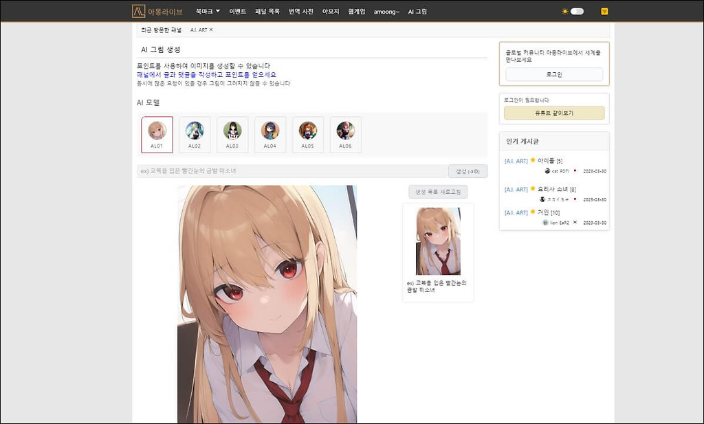 AI 커뮤니티 중 하나인 아몽라이브 사이트에서 글과 댓글을 작성해 얻을 수 있는 포인트를 사용해 무료로 그림을 생성해볼 수 있습니다. 총 6개의 모델 중 하나를 선택하고, 그림을 표현하는 프롬프트를 한국어로 입력해 일러스트를 생성할 수 있습니다.