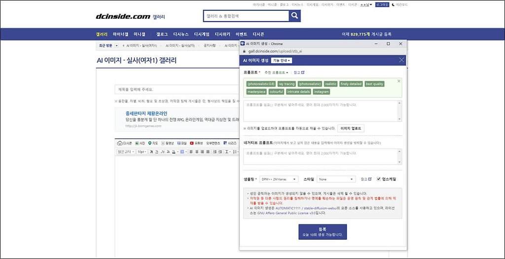 한국 최대 커뮤니티 사이트인 디시인사이드에서도 2023년 3월 16일 AI 이미지 생성 기능이 추가되었습니다. 배경, 도시, 야경, 동물, 실사, 중세, 기타, 애니 등 여러가지 컨셉이 있고, 각 갤러리로 이동한 후 글쓰기 > AI 이미지를 클릭해 생성할 수 있습니다. 단, 하루에 10회만 생성이 가능합니다.