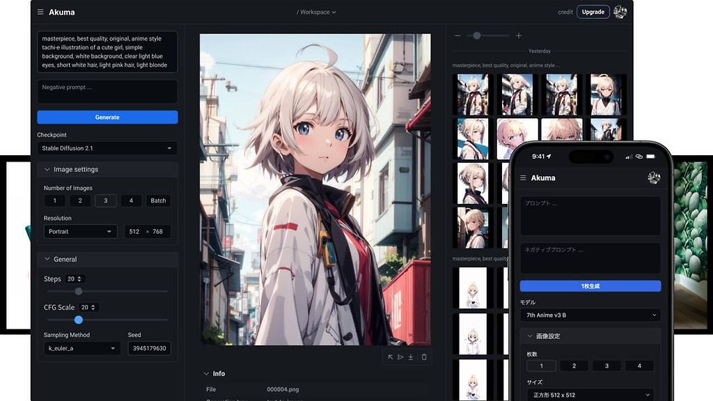 Akuma AI는 클라우드 웹UI 서비스로 누구나 쉽게 사용할 수 있지만 프로와 같은 퀄리티를 낼 수 있도록 하는 것을 목표로합니다. Stable Diffusion WebUI처럼 프롬프트, 부정 프롬프트, 매개변수, 샘플러를 커스텀할 수 있고, Stable Diffusion에서 작동하는 모델이라면 직접 업로드해 원하는 모델을 사용할 수 있다는 것이 가장 큰 특징입니다.