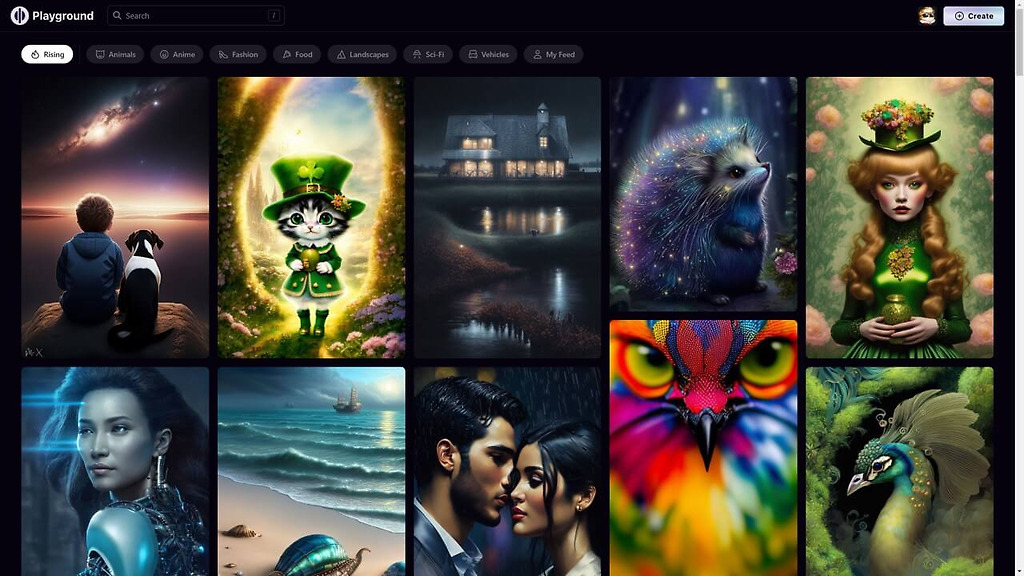 Playground는 화가가 그린 작품 같은 이미지를 잘 생성하는 사이트로 구글 연동 로그인 후 메인 홈페이지 Create 버튼을 눌러 이미지를 생성할 프롬프트를 입력할 수 있습니다. 단, 어떤 유형을 선택하든 미국, 서양 느낌이 강하게 난다는 것이 장점이 되거나 단점이 될 것 같습니다.