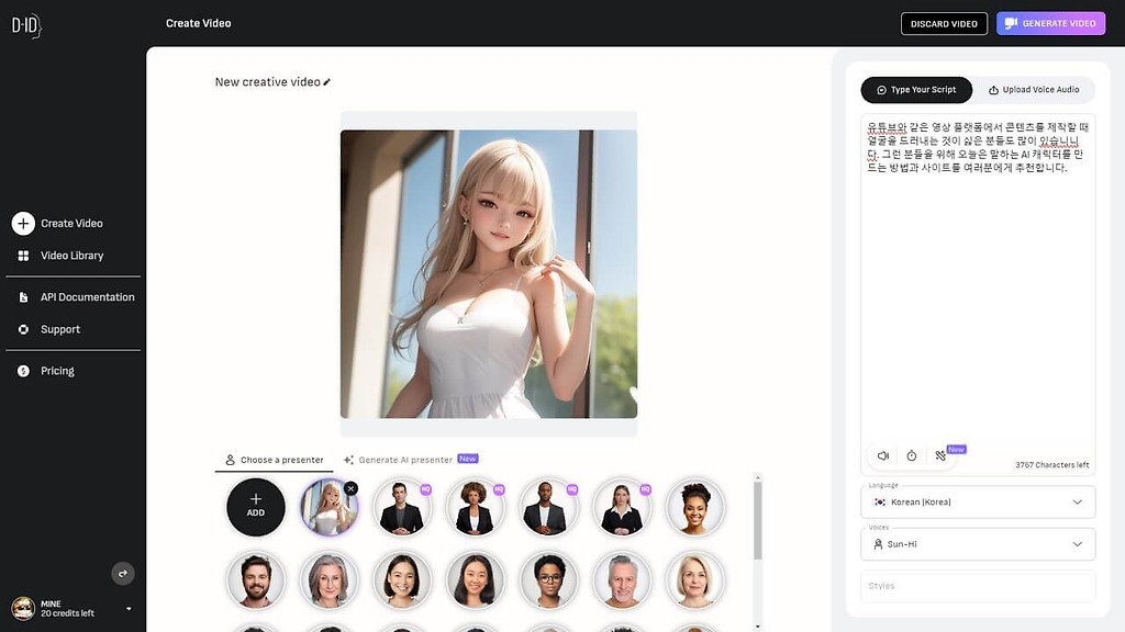 Studio D-ID는 유튜브를 운영하고 싶지만 본인의 얼굴이나 목소리를 사용하고 싶지 않은 사람에게 매우 유용한 사이트입니다. 바로 자신만의 AI 아바타를 만들 수 있는 사이트로 이미지를 업로드하거나 기본으로 제공하는 아나운서를 선택하고, 대사를 입력하면 이미지가 움직이며 입력한 대사를 읽어줍니다.