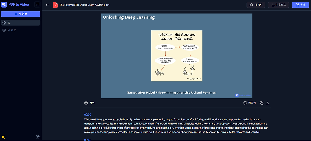 만약 당신도 저처럼 기획안이나 보고서를 더 시각적이고 설득력 있게 전달하고 싶다면, PDF to Video는 꼭 시도해 볼 만한 도구라고 생각합니다. 특히 디자인이나 영상 편집에 익숙하지 않더라도, 이 서비스라면 간단하게 문서를 영상으로 변환해 새로운 방식의 프레젠테이션을 만들어낼 수 있습니다.