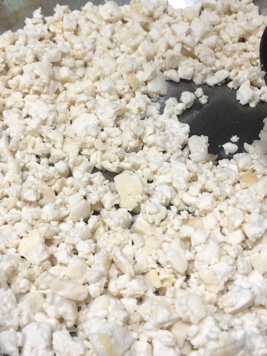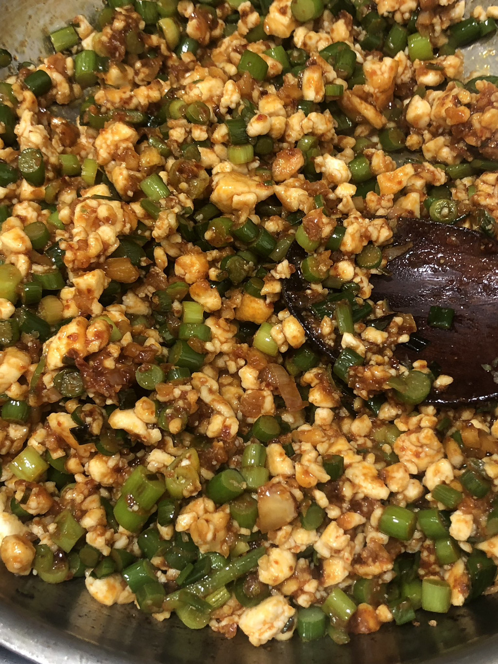 - 두부 으깨서 수분 날아갈 때까지 볶다가 마늘쫑 볶기
