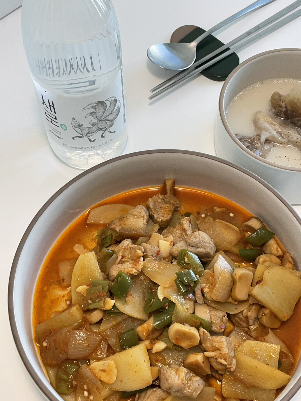 고춧가루 한숟갈, 진간장 네숟갈, 물 반컵