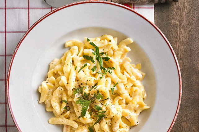 Peel the onion and chop finely. Heat 1 tablespoon of oil in a pot, add the onion cubes and sauté until translucent. Add milk and cream, bring to the boil and season with salt, pepper and stock powder to taste. Then sprinkle in the cheese and let it melt. Now add the spaetzle and stir. At the end add the parsley.