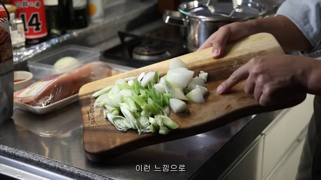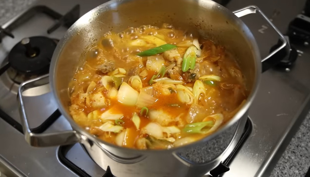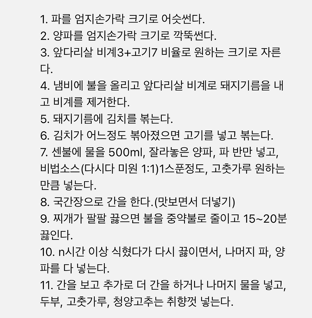 재료: 껍데기 있는 앞다리살 400g, 종가 맛김치 400g, 파, 양파, 다시다/미원 1티스푼, 고춧가루, 국간장, 물