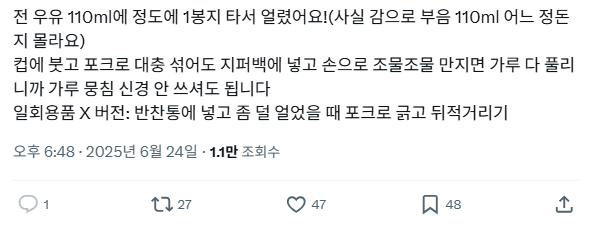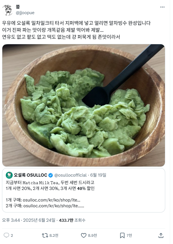 우유에 오설록 밀차밀크티 타서 지퍼백에 넣고 얼리면 말차빙수 완성입니다 이거 진짜 파는 맛이랑 개똑같음 제발 먹어봐 제발... 연유도 없고 팥도 없고 떡도 없는데 걍 퍼묵게 됨 존맛이라서