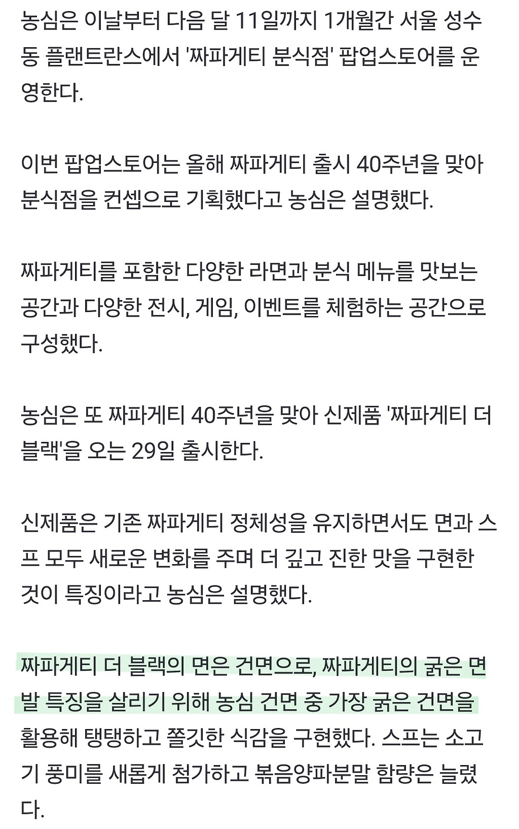 짜파게티 40주년 기념 신제품 짜파게티 건면 출시