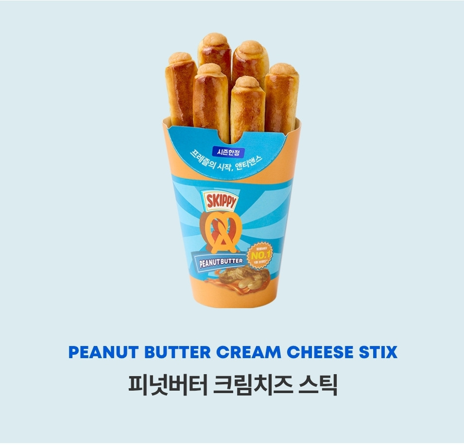 피넛버터 크림치즈 스틱 땅콩의 고소함과 짭짤한 맛이 어우러진 스키피 피넛버터에 부드럽고 달콤한 앤티앤스 크림치즈를 더한 단짠 고소함의 정석