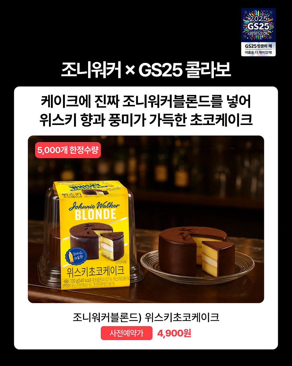 지금 5,000개 한정수량으로우리동네GS 앱에서 사전예약 중📲🍫조니워커블론드)위스키초코케이크 4,900원✅구매 경로: 우리동네GS 앱 > GS25 > 편의점 사전예약✅행사 기간: 8/20(수) ~ 8/24(일)✅수령 방법: 8/30(토) 지정 점포에서 직접 수령※ 19세 미만 구매 불가