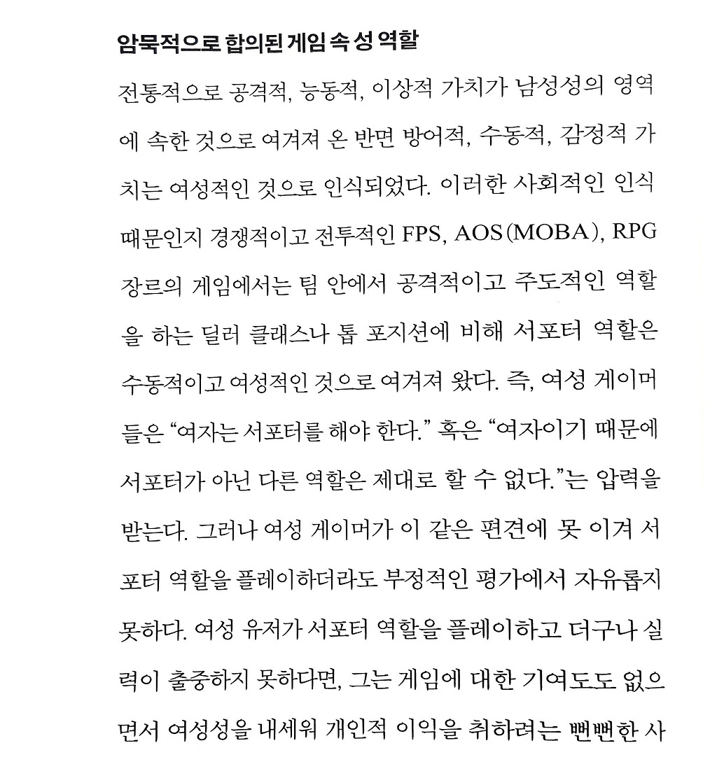 여성 게이머들은 서포터를 해야 한다는 압력을 받는다. 그러나 편견에 못 이겨 서포터를 하더라도 부정적인 평가에서 자유롭지 못하다. 《여성 게이머는 총을 쏠 수 있는가》
