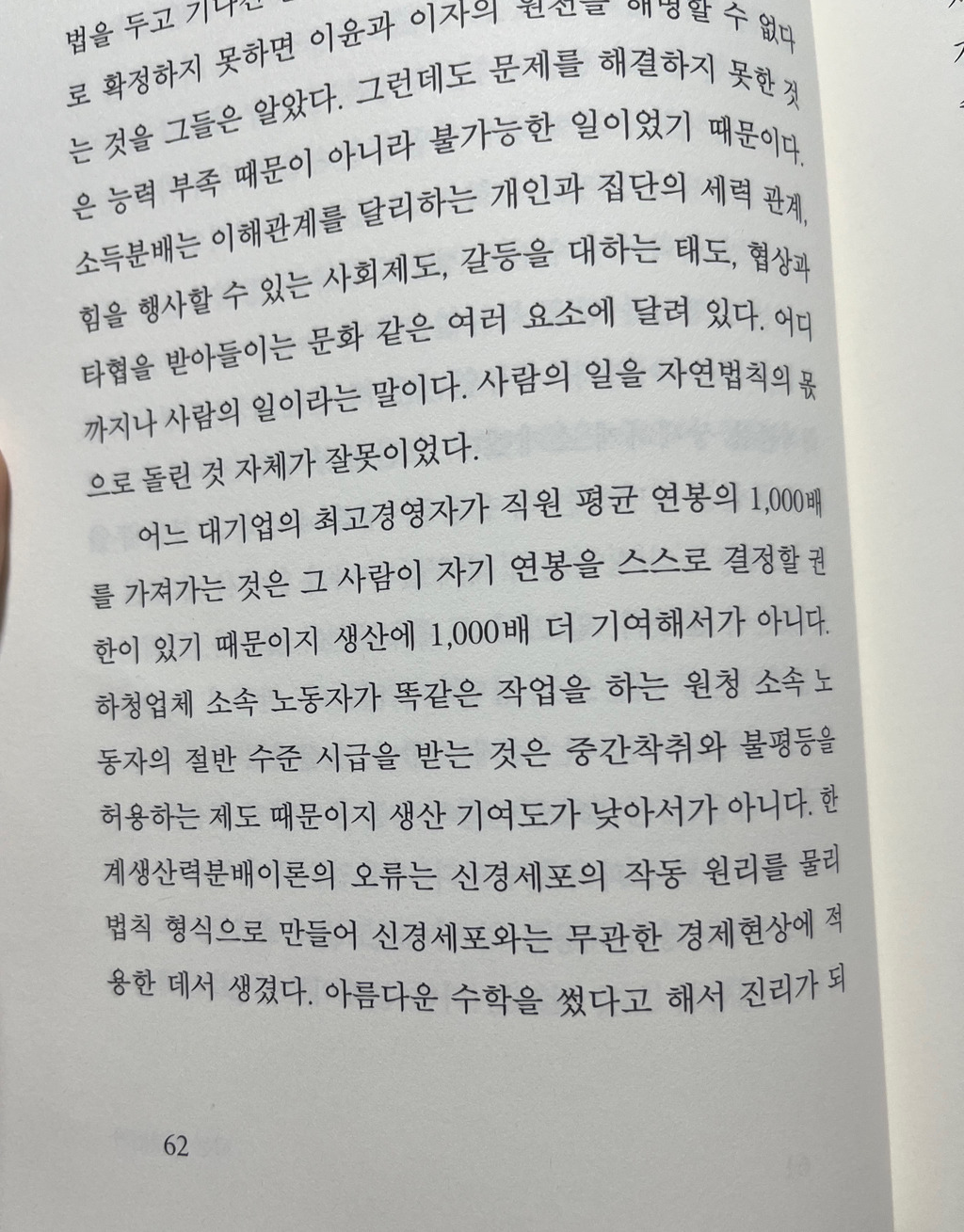 하청업체 소속 노동자가 똑같은 작업을 하는 원청 소속 노 동자의 절반 수준 시급을 받는 것은 중간착취와 불평등을 허용하는 제도 때문이지 생산 기여도가 낮아서가 아니다. 한계생산력분배이론의 오류는 신경세포의 작동 원리를 물리 법칙 형식으로 만들어 신경세포와는 무관한 경제현상에 적용한 데서 생겼다. 아름다운 수학을 썼다고 해서 진리가 되는 건 아니다. 그런데도 경제학자들은 여전히 그 이론을 강당에서 가르치고 대중에게 전파한다. 부자가 좋아하는 우화를 퍼뜨리면 보상이 따라온다는 것 말고는 다른 이유를 찾을 수 없다.