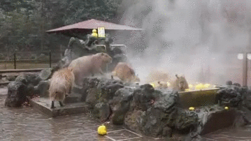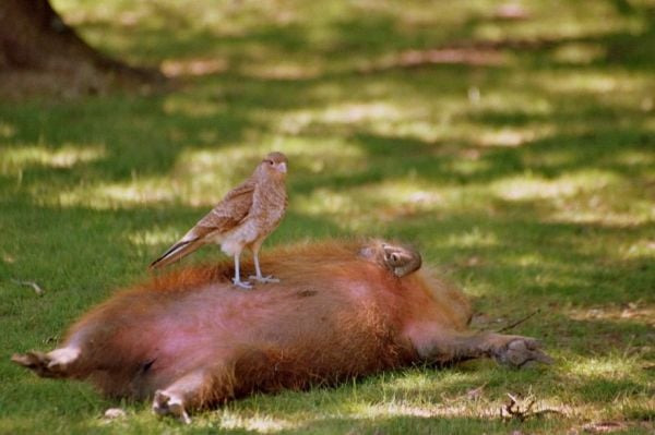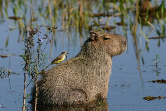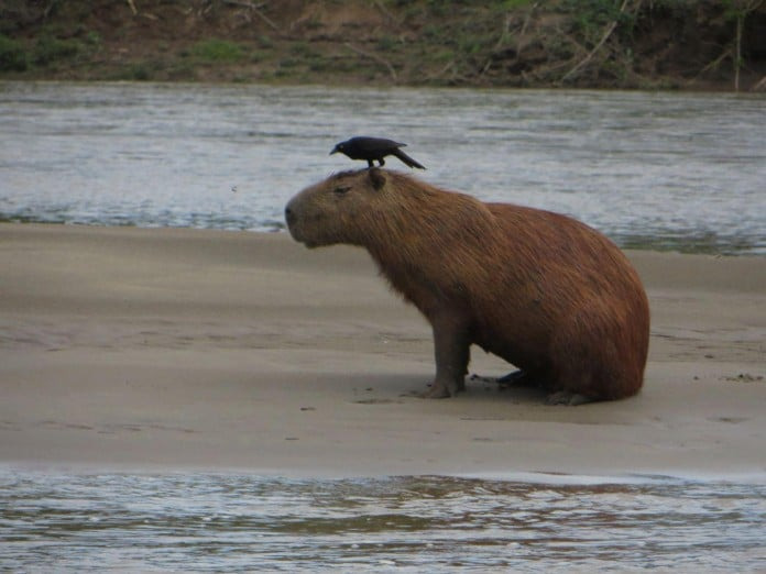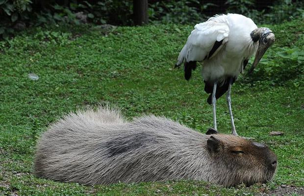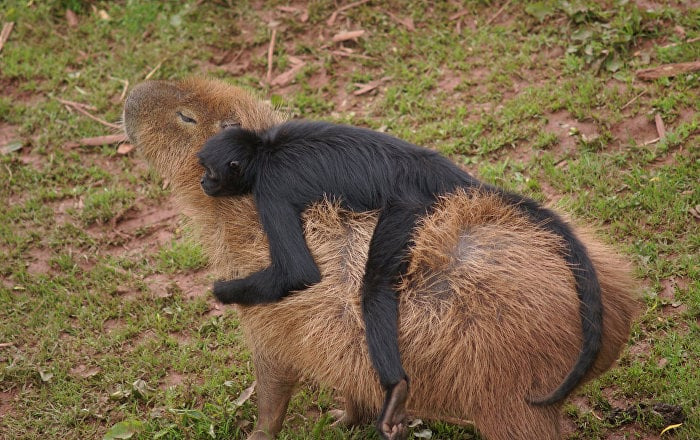 카피바라는 무리지어 다니는 특성을 지닌 온순한 동물이어서 그런지 다른 동물들과도 높은 친화력을 보여줌.