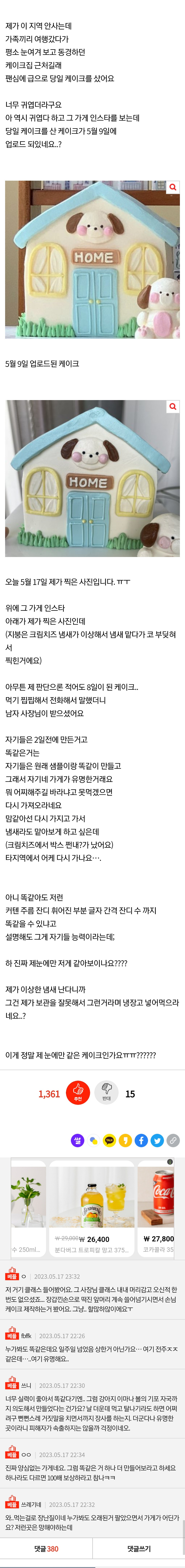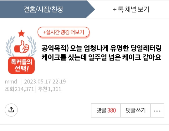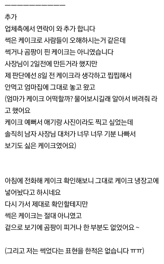 오늘 엄청나게 유명한 당일레터링 케이크를 샀는데 일주일 넘은 케이크 같아요