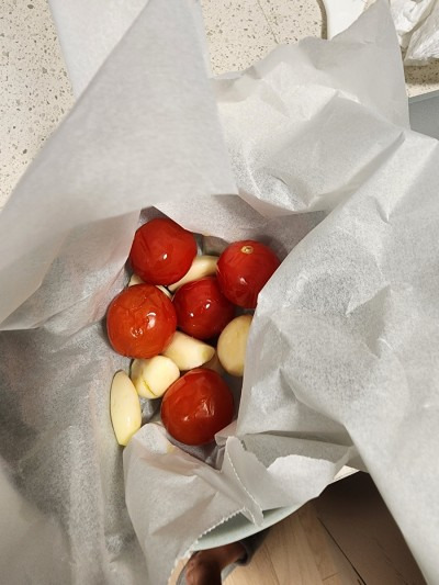 토마토와 통마늘을 넣고 올리브유 휘휘 둘러주고 호일로 꽁꽁 감싸서 3분간 전자렌지에 데워줌
