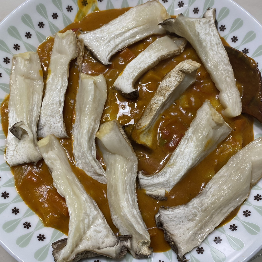 이것은 제가 만들었는데요통버섯을 에어프라이어에 200도 8분씩 뒤집어서 돌리면 개맛있는 거 아시나요? 그리고 죽죽 찢어 먹으면 안에 육즙 흘러넘침그리고 만들어진 카레에 불닭소스+케첩+우유 넣어서 다시 끓이면 씁하씁하 매콤 카레가 만들어집니다침고여...