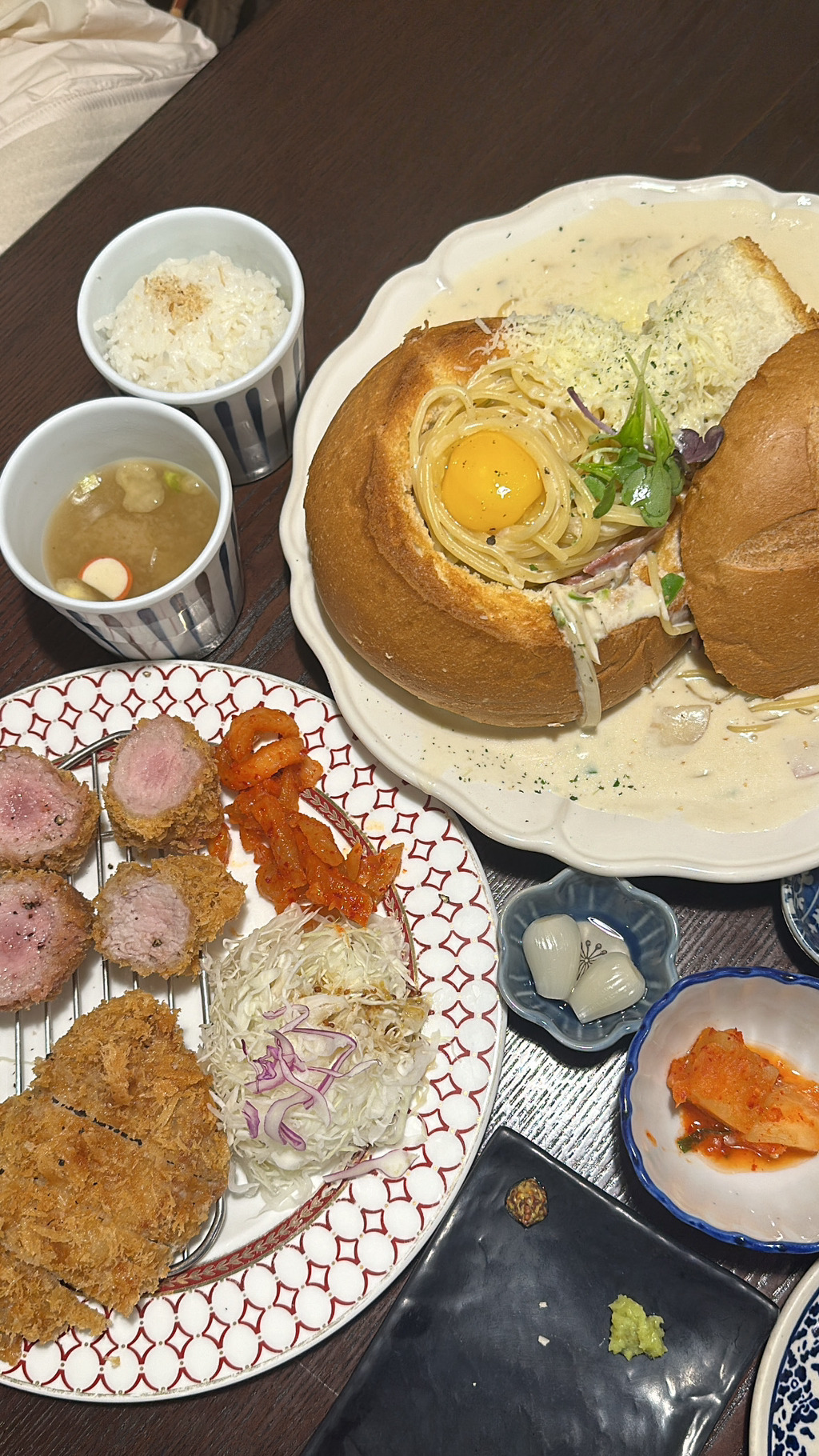 빠네에 돈까스 조합 생각 못해 봤는데잘 어울리고 맛있네계란 노른자 돌돌 말아 크림 소스에 비벼 먹으니까세상 존맛 ㅠㅠㅠ등심 돈까스는 좀 질겼지만ʚ̴̶̷̆ ̯ʚ̴̶̷̆