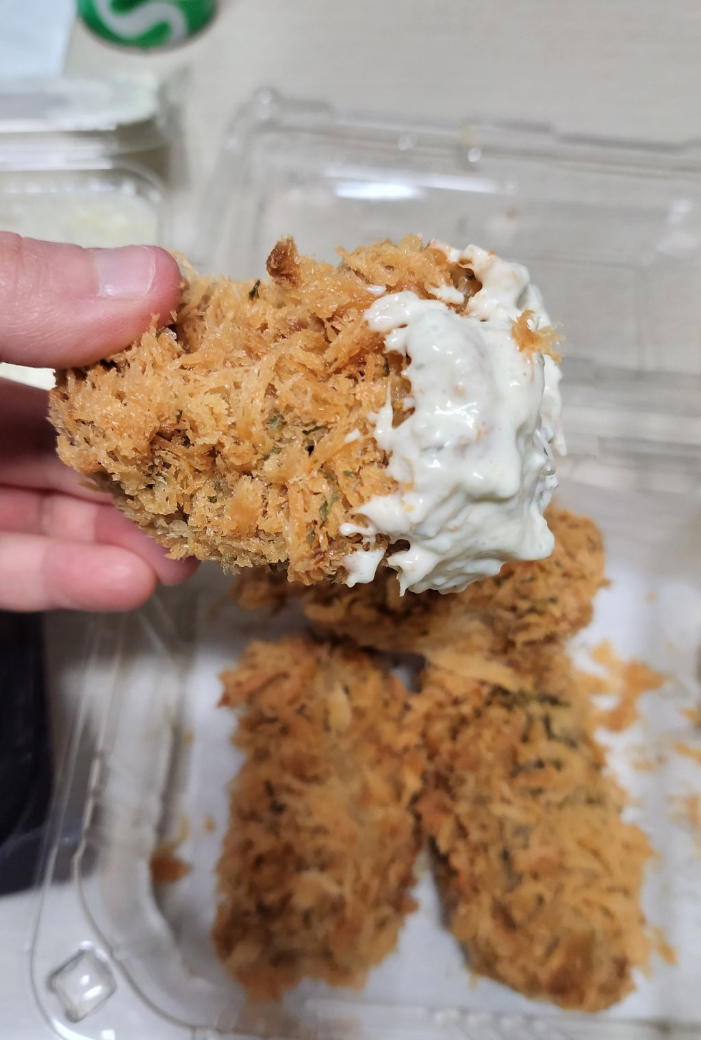 빵가루 튀김 미쳤어... 여기 튀김 사이즈도 엄청 크고 타르타르 소스 찍어서 콱으작 씹으면 완전 고소 그 잡채...ㅎ 어제는 주문 거절 당했는데 오늘 또 주문하니까... 사장님이 마감하고 알바분 데려다 주시다가도 다시 턴하셔서 와서 해주셨다ㅎㅎㅎ 저녁 겸 야식 꿀맛👍