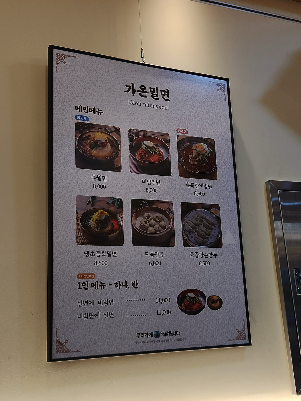 밀면 먹으러 오면 물을 먹을까 비빔을 먹을까 늘 고민인데, 어라.. 반반이 생겼네요. 촉촉한 비빔면이 바로 그거예요. 자박자박하게 물기있는 비빔밀면이라는거~ 고민해결!
