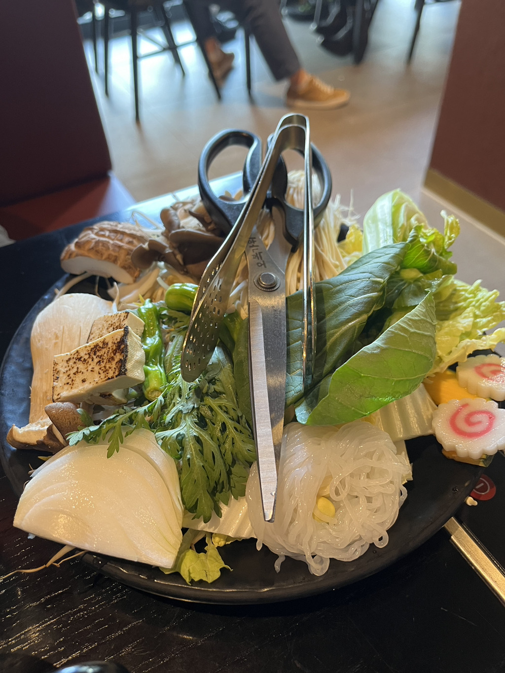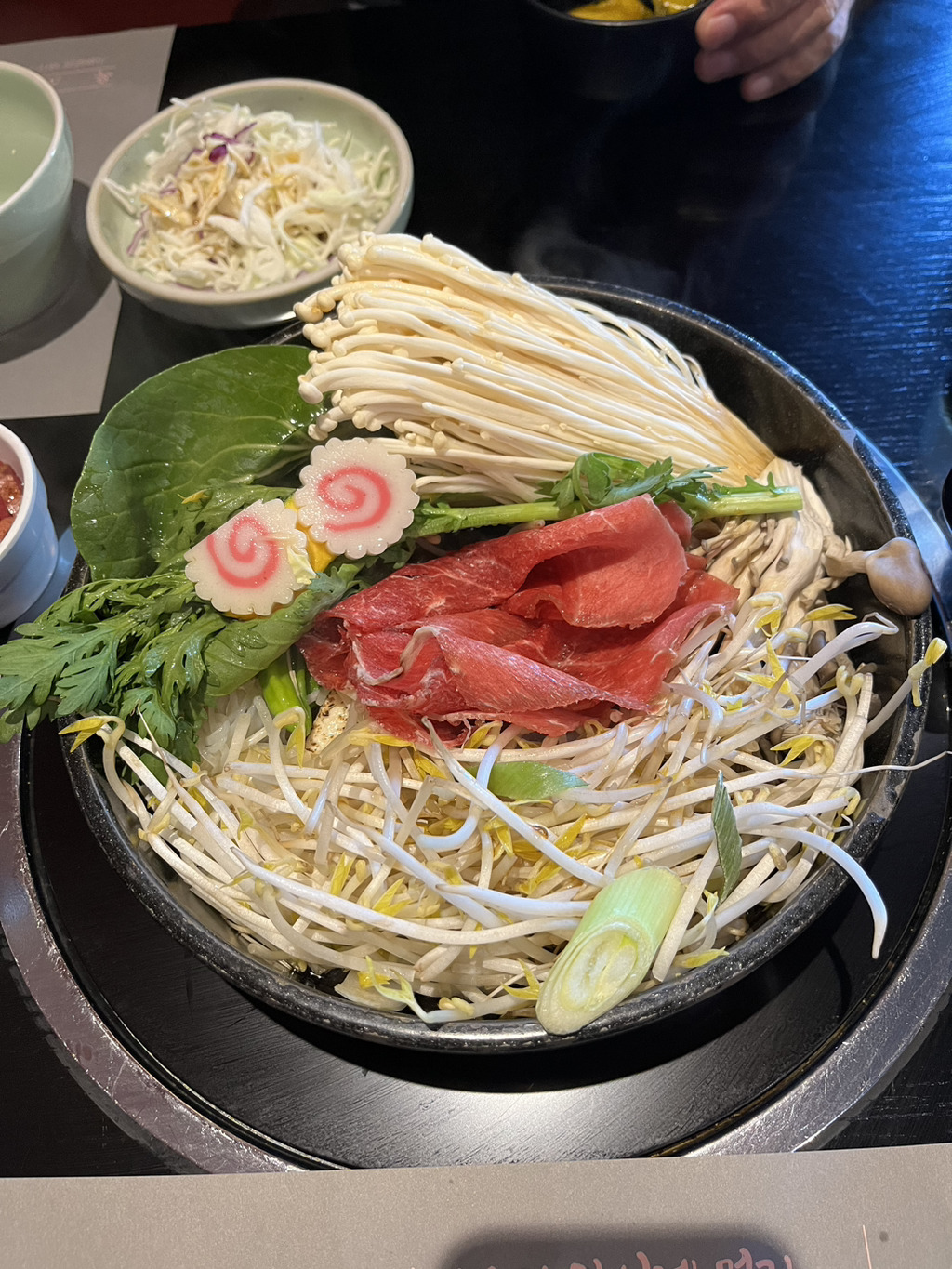 식당은 잠실 옥소반처음먹어본 스키야키 버터를 두른 팬에 야채와 간장물을 넣고 우러나온 채수에 고기를 익혀 먹는 것 나쁘진 않았으나 샤브샤브가 더 개취 이건 한번쯤 먹어봄직한 음식이다