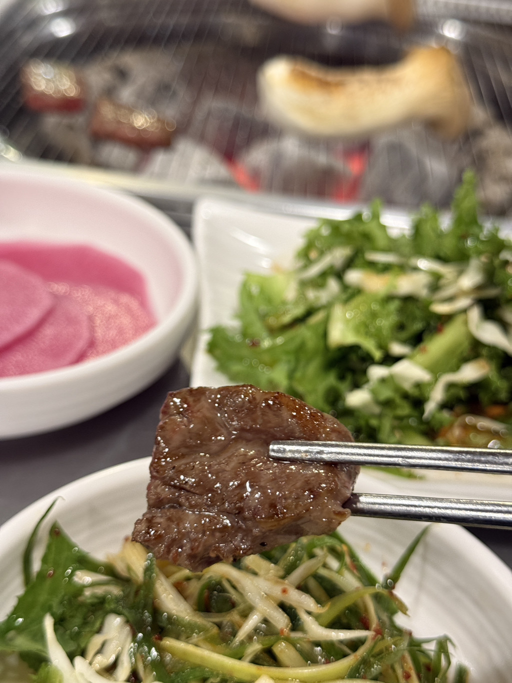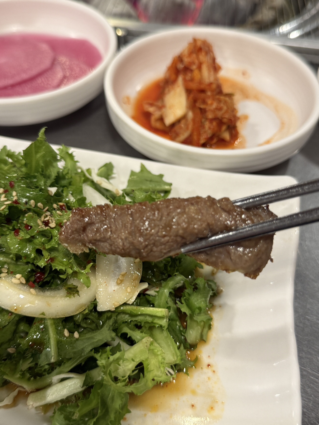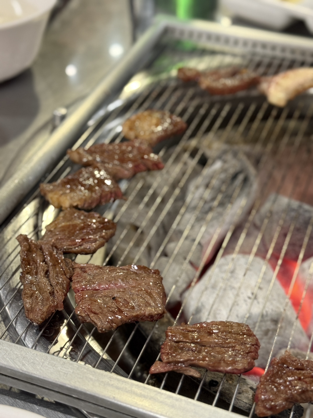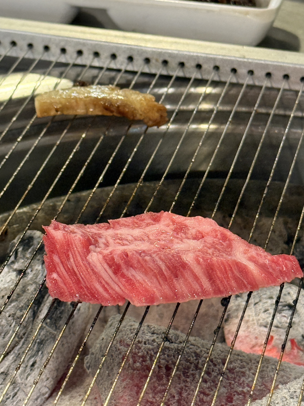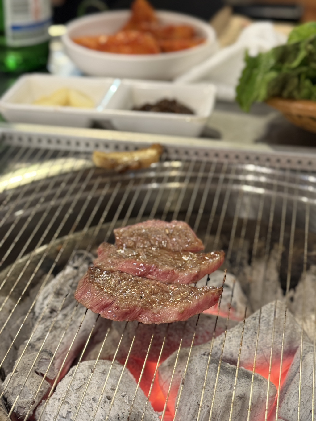 도착하자마자 바로 고기부터 골랐다. 정육식당이라서 고가 결제랑 식장 결제가 따로다. 친구가 고기 끈(?)이 긴 친구라서 믿고 따라갔다. 우리가 고른 건 등심, 살치살, 업진살. 조합이 미쳤다. 한 우물만 파는 장인정신 같은 선택이었다. 고기를 한 점 입에 넣었는데 그냥 ‘아…’ 소리가 절로 나온다. 정말 고기가 살살 녹는다는 표현이 괜히 있는 게 아니었다. 씹기도 전에 없어져 버리는 그 부드러움 때문에 술도 미친 듯이 들어간다. 고기가 맛있으니까 술이 달고, 술이 달아서 고기가 또 더 맛있고… 행복의 무한 루프에 빠졌다.