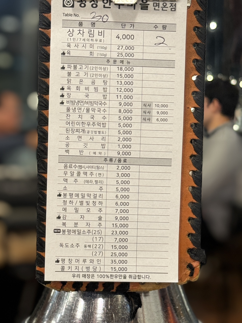 식당 이름은 평창창한우마을 면온점. 네이버에서 당일 예약이 가능했고, 무엇보다 이곳은 픽드랍 서비스를 해준다는 게 결정적이었다. 여행 와서 술 안 마실 수는 없으니까 픽드랍은 필수였다. 예약은 30분 단위로 가능하고 전화로 픽업 요청을 하면 된다. 우리 숙소가 휘닉스파크였는데, 휘닉스파크 블루동과 호텔 사이 주차장에서 픽업을 해주셨다.