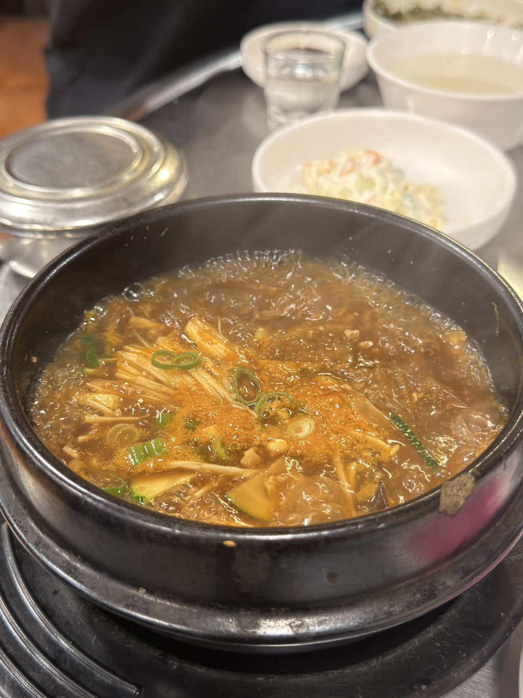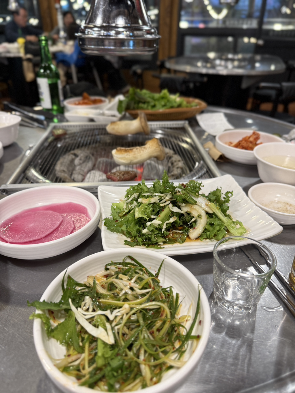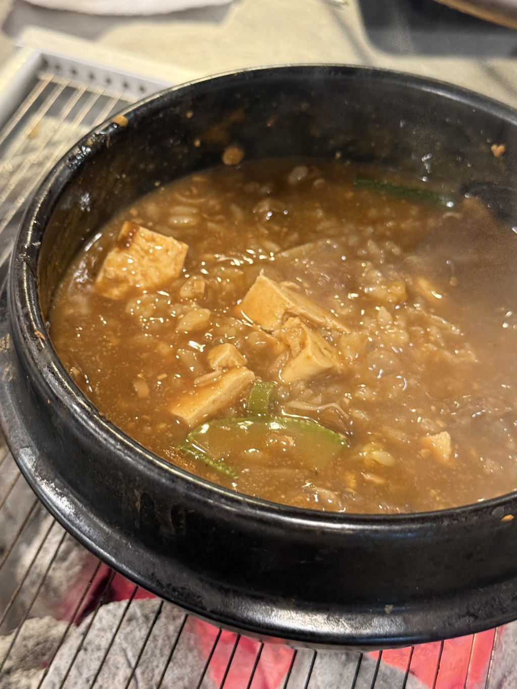 버섯도 왜 이렇게 맛있는지 이해가 안 됐다. 보통 고기 먹다가 버섯은 그냥 구색 맞추기 느낌으로 먹는 경우가 많은데, 이 집 버섯은 따로 팔아도 줄 설 맛. 고기뿐 아니라 곁들이는 것 하나하나가 감동이었다. 그리고 마지막은 된장찌개로 마무리했다. 이 된장이 그냥 식당용 된장이 아니라 뭔가 집에서 할머니가 끓여준 느낌의 그런 된장맛이었다. 까막된장이라고 하셨다. 구수하고 깊고 깔끔해서 밥을 말아 ‘된장술밥’을 만들어 먹었는데, 이게 또 술안주로도 최고였다.