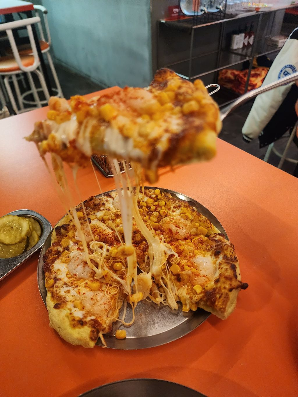 치즈 잘 늘어나고 새우랑 옥수수 들어간 피자인데 맛있어요 혼자 먹기도 좋아서 6인치 피자 추천그리고 1인 예약도 가능하고 네이버 예약하면 사이드 5000원 쿠폰주니 꼭 써보세요