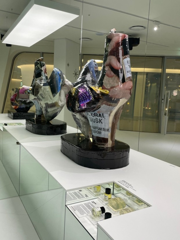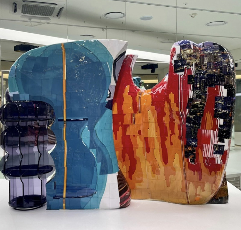 이번 전시장에 자리한 10점의 작품은 매끄럽게 흐르는 추상적 형태 속 의자와 신발, 향수, 안경과 같은 일상적 물건들 틈새로 한강, 네온사인, 킥보드, 거리 음식 등 상징적인 서울의 풍경이 자리한다고 해요🛴