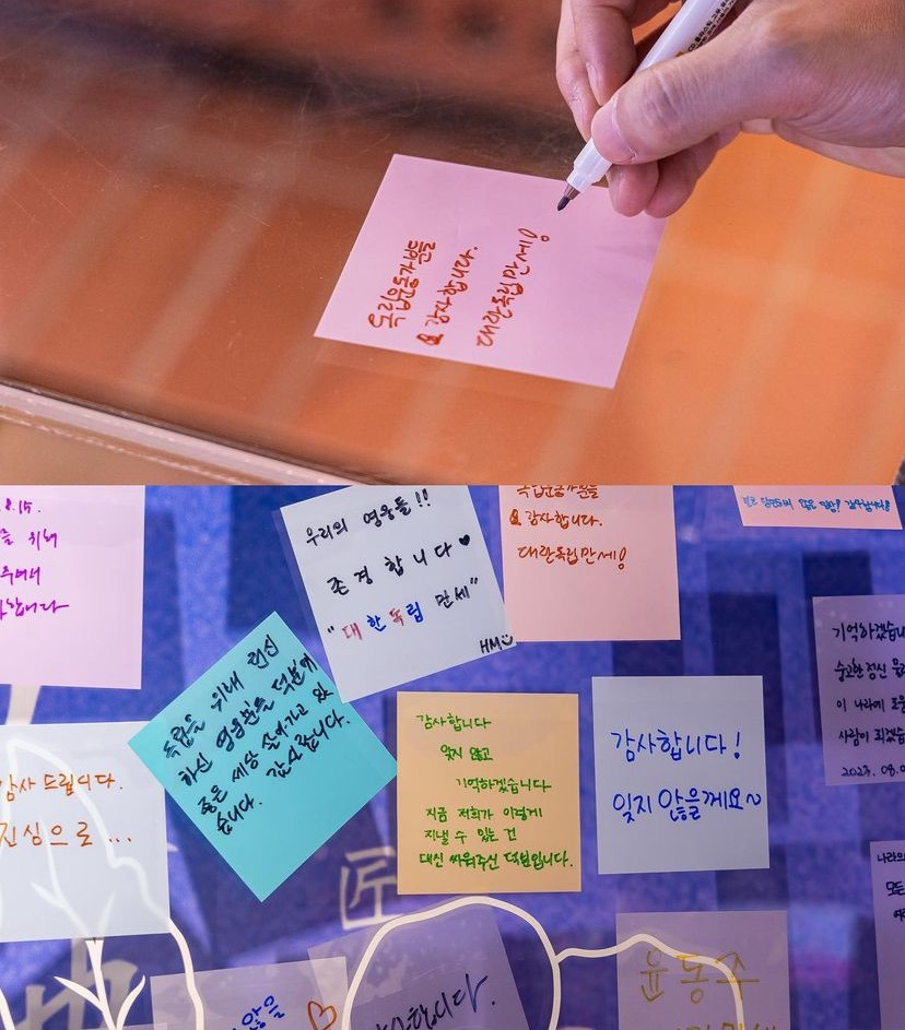전시 공간에 있는 메시지을 통해 독립운동가들에게 감사메시지를 남기면 1건당 815원의 기부금이 적립되어 국가보훈부와 함께 독립운동가 관련 단체에 기부된다고 해요👍