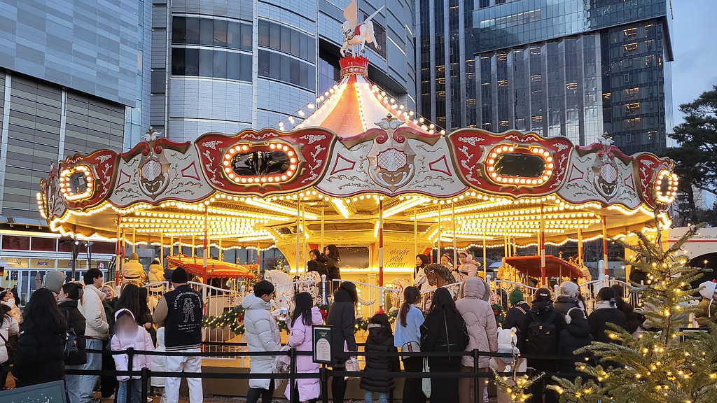 회전목마에 애들이 엄청 많고 줄 서 있어요.