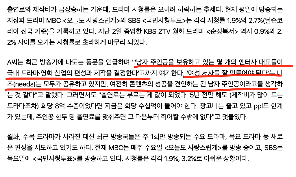 그러니까 쓸데없이 몸값높은 남배우들 그만 쓰고 새로운 얼굴들 좀 쓰라고.... 여배우들 좀 많이 쓰고.. 어차피 주 시청층 여자라서 여성 주연 서사 작품도 잘팔리는데 술도녀만 봐도 그렇고.. 쓸데없는 거에 돈 갖다버리고 정작 작품엔 투자를 안하니까 망하지 뭐가 문젠지 모르나.. 제발 시청률 집착해서 팔아먹을 생각 하지말고 좀 작품을 만들길