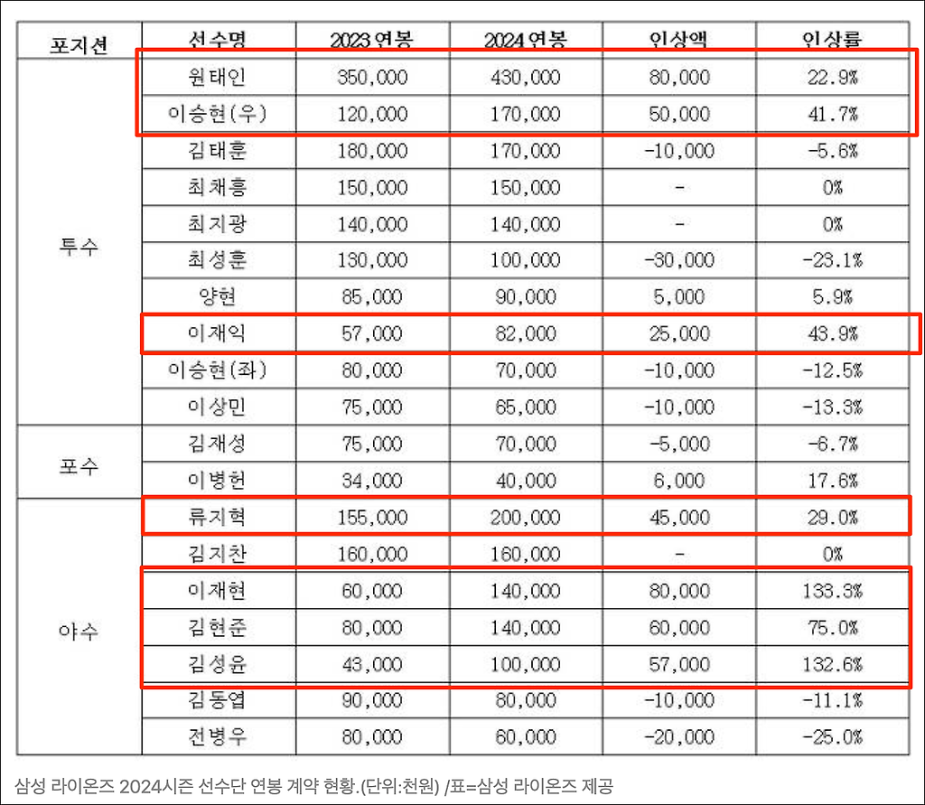 [공식발표] 삼성 2024 선수별 연봉 계약 현황