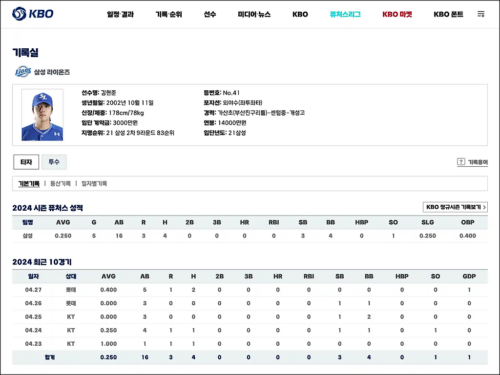 2군 내려가서 16타스 4안타, 타율 2할5푼. 흠.. 이정도로는 1군으로 콜업되기는 힘들겠어. 적어도 야수가 1군에 콜업되려면 3할5푼 이상은 쳐야할 것 같은데, 아직 타격감이 올라오지 않네. 삼성이 이렇게 분위기 좋을때 김현준도 올라와서 같이 뛰면 좋겠는데...