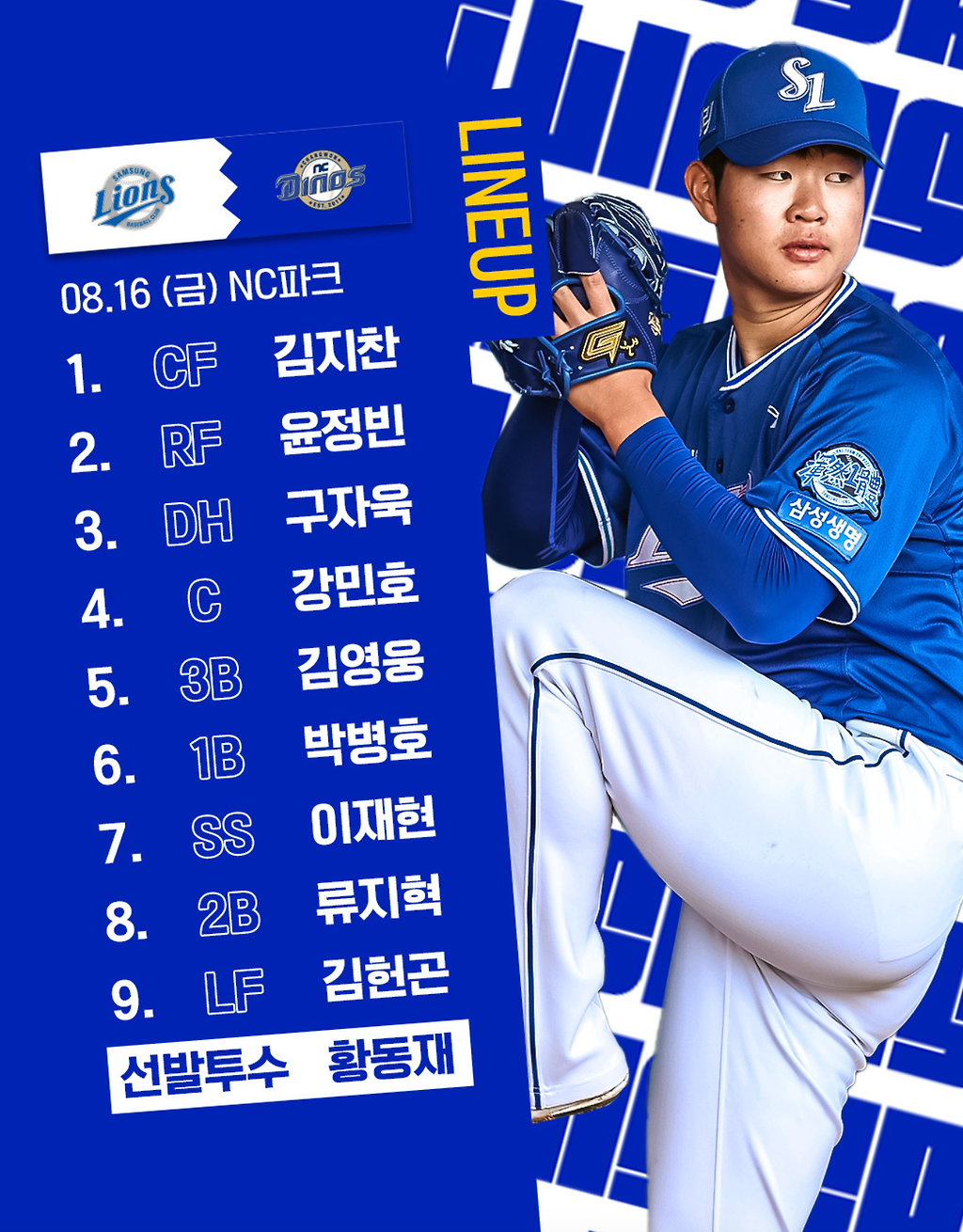 삼성은 16일 창원NC파크에서 NC 다이노스와 맞붙는다. 이날 삼성은 황동재를 선발로 올려 창원 원정 첫날 기선제압을 노린다.