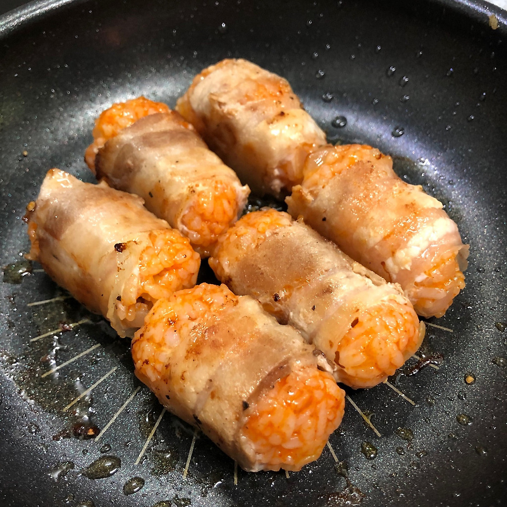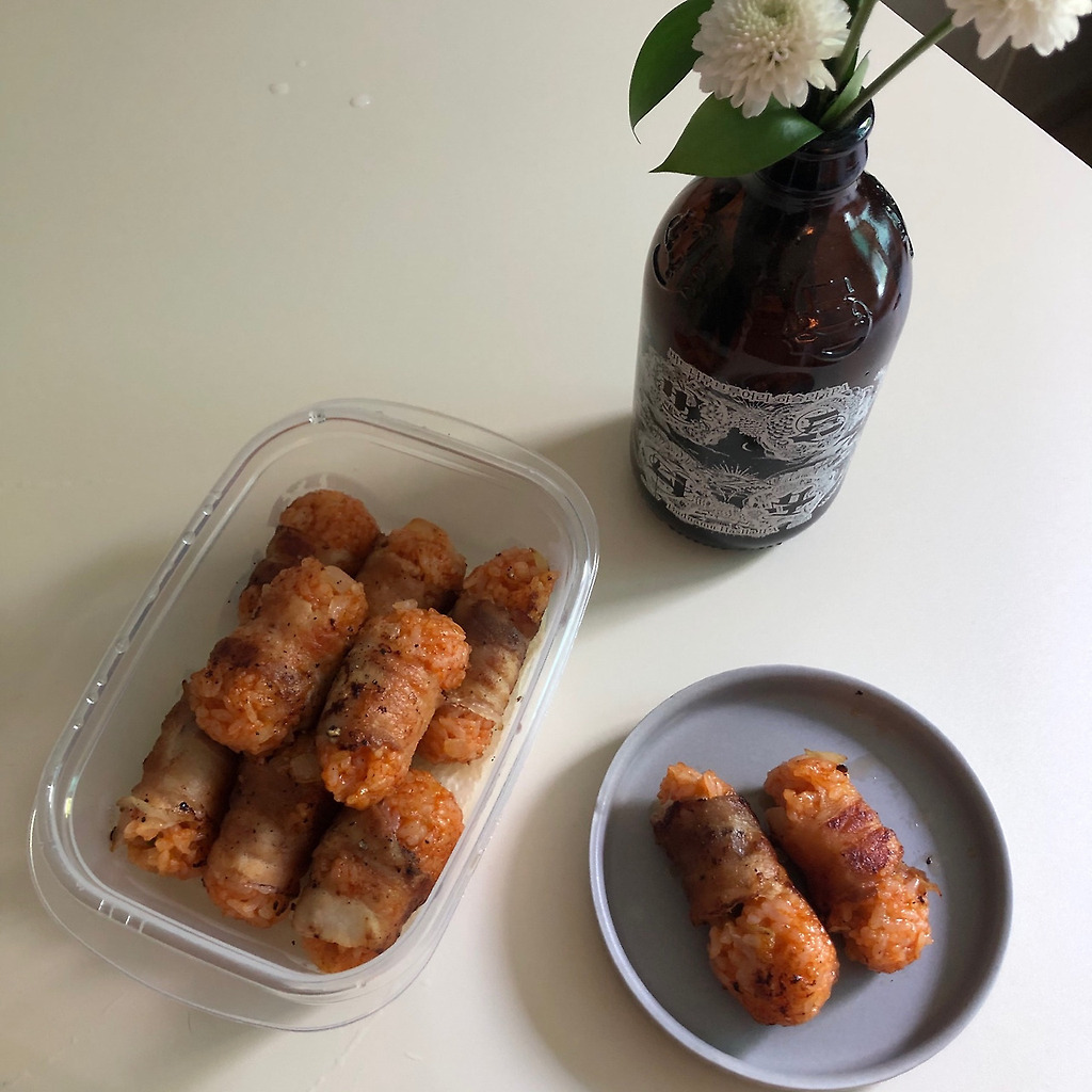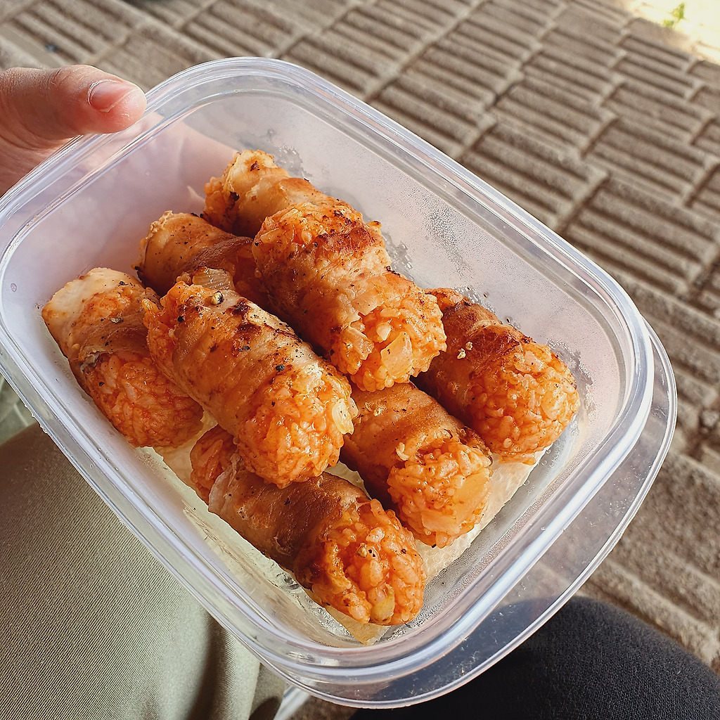 어디서 본건있어가지고 매콤한 주먹밥에 대패삼겹살을 말아서 튀겨먹자길래