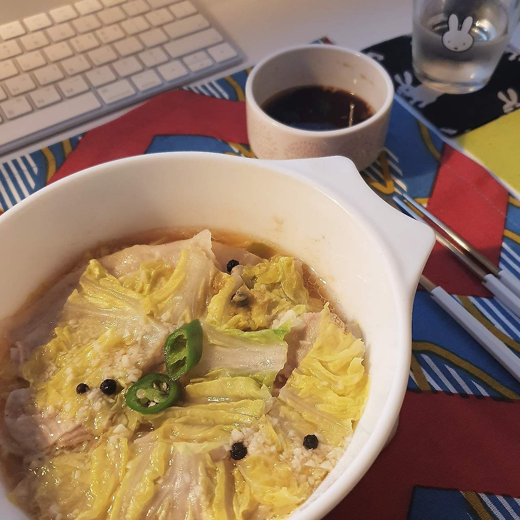 알배추사다가 대패삼겹살이랑 켜켜이 쌓아서 술찜해먹었어