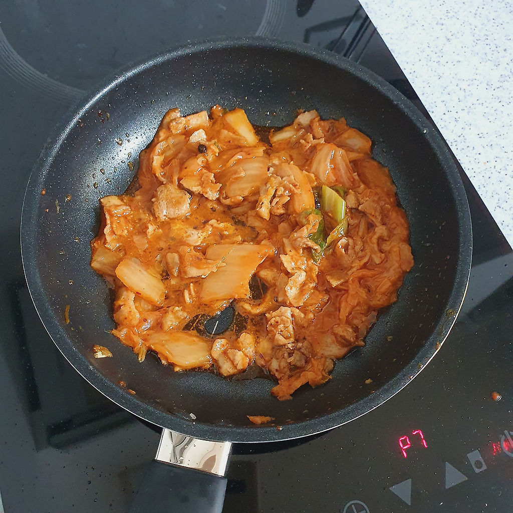 냉동 삼겹살 넣고 칼칼하게 끓였어.