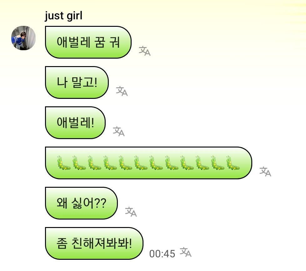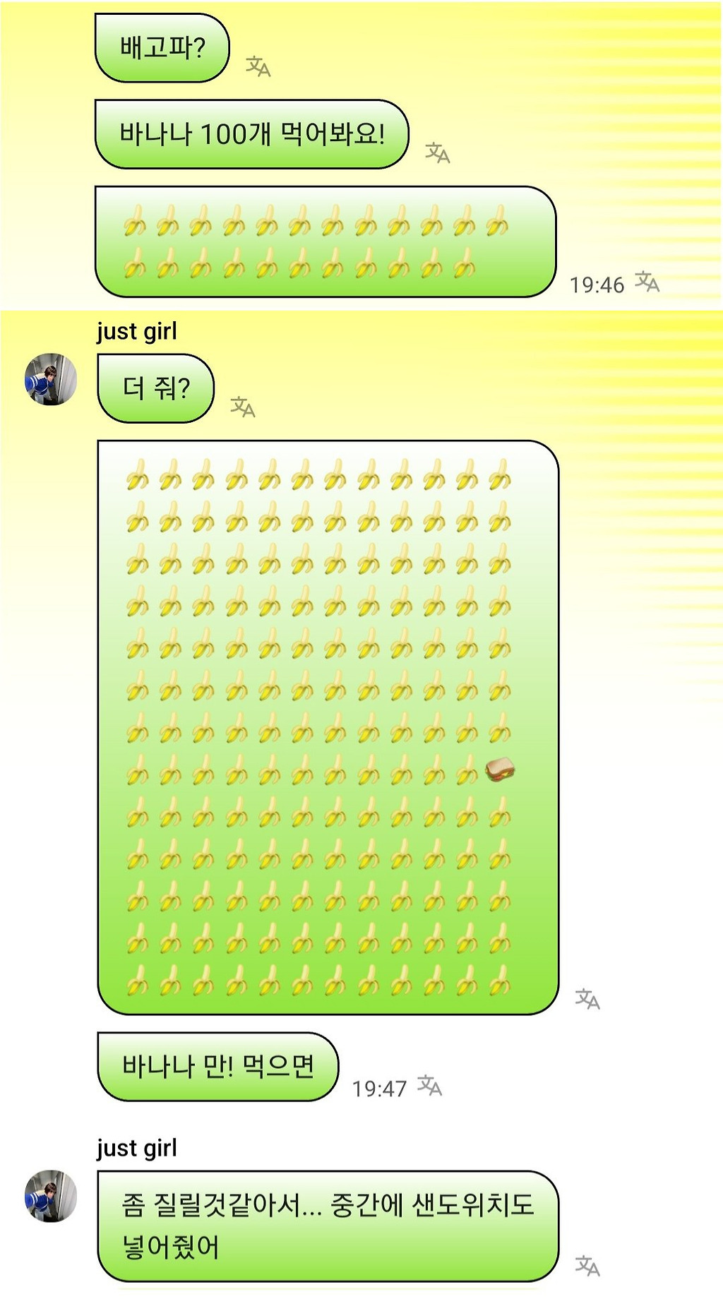배고픈 팬한테 바나나 임티 100개보내면서 먹으라하고 애벌레 꿈 꾸라고 애벌레 임티 버내주고 굿나잇 인사로 물개 원숭이 복어 공룡 하마 임티 보내면서 심심하면 같이 놀으라고 잘 챙겨주라함