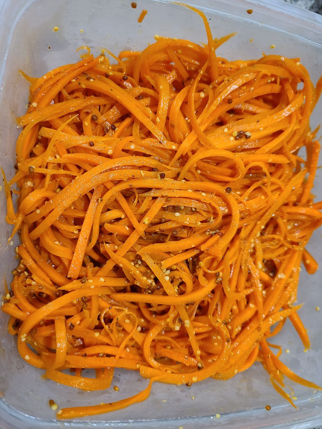 네!당근 채칼로 썰고 소금 쳐서 10분 이상 절여놓구요 물나오는거 뺀 다음에 홀그레인 머스타드 1큰술, 레몬즙 1큰술, 올리브유 2큰술, 설탕 0.5큰술넣어서 비볐습니다!