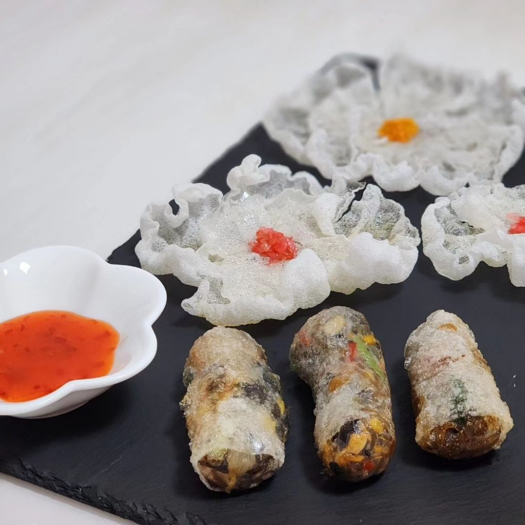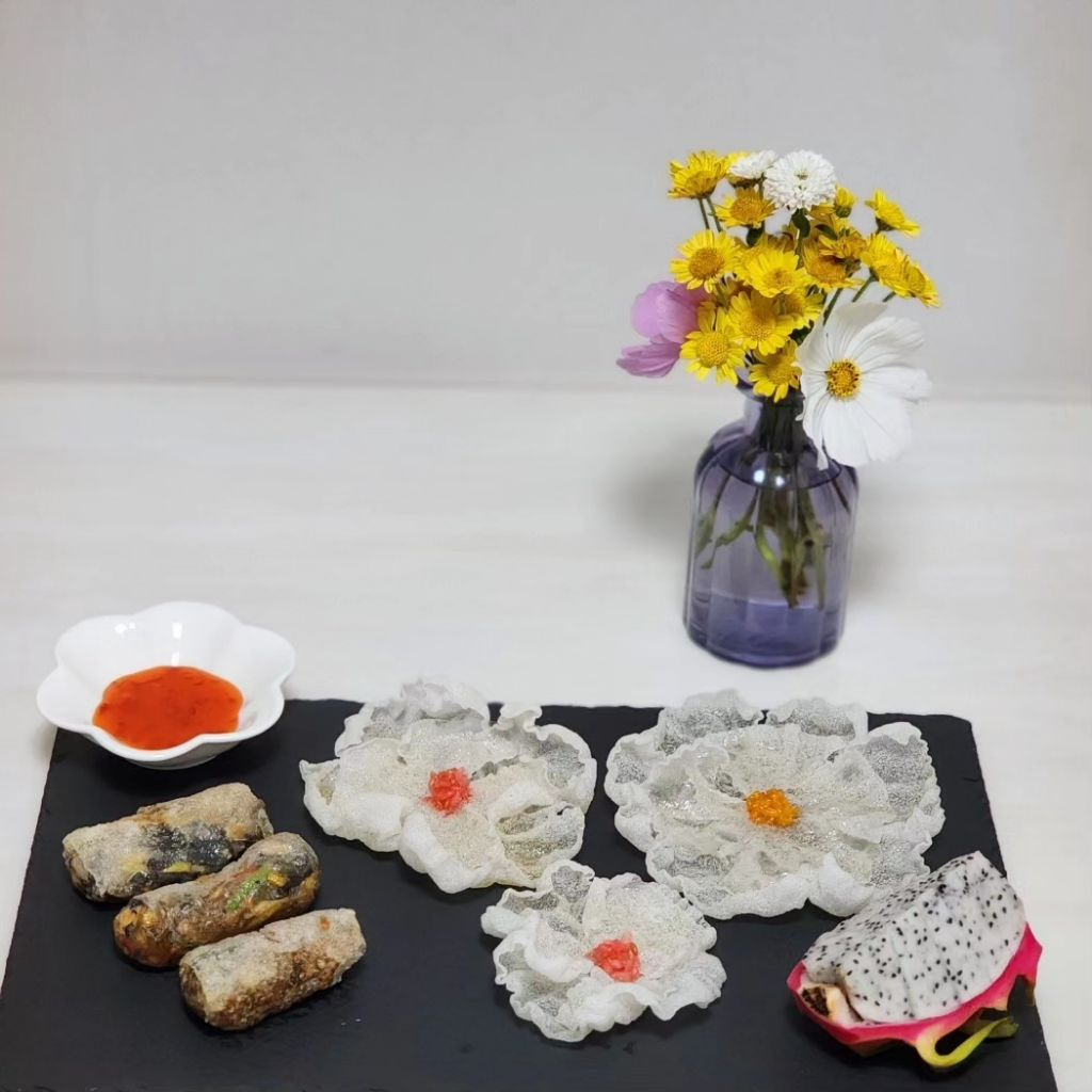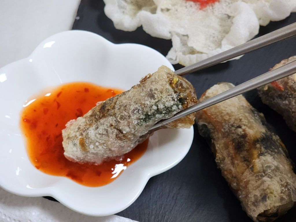 남은 잡채 라이스페이퍼에 말아서튀겼어요 빵가루 묻혀 튀김 더 맛있는데없어서~~기냥 튀김요메콤한 칠리소스에 찍어먹음 맛나요👍튀기는 김에 라이스페이퍼꽃 튀김도해봤어요~~처음 해본거라 온도조절 실패로꽃이 활짝 이쁘진 않네요소금 촵촵 뿌려서 맥주 안주로 드심바사삭~~하니 맛나용