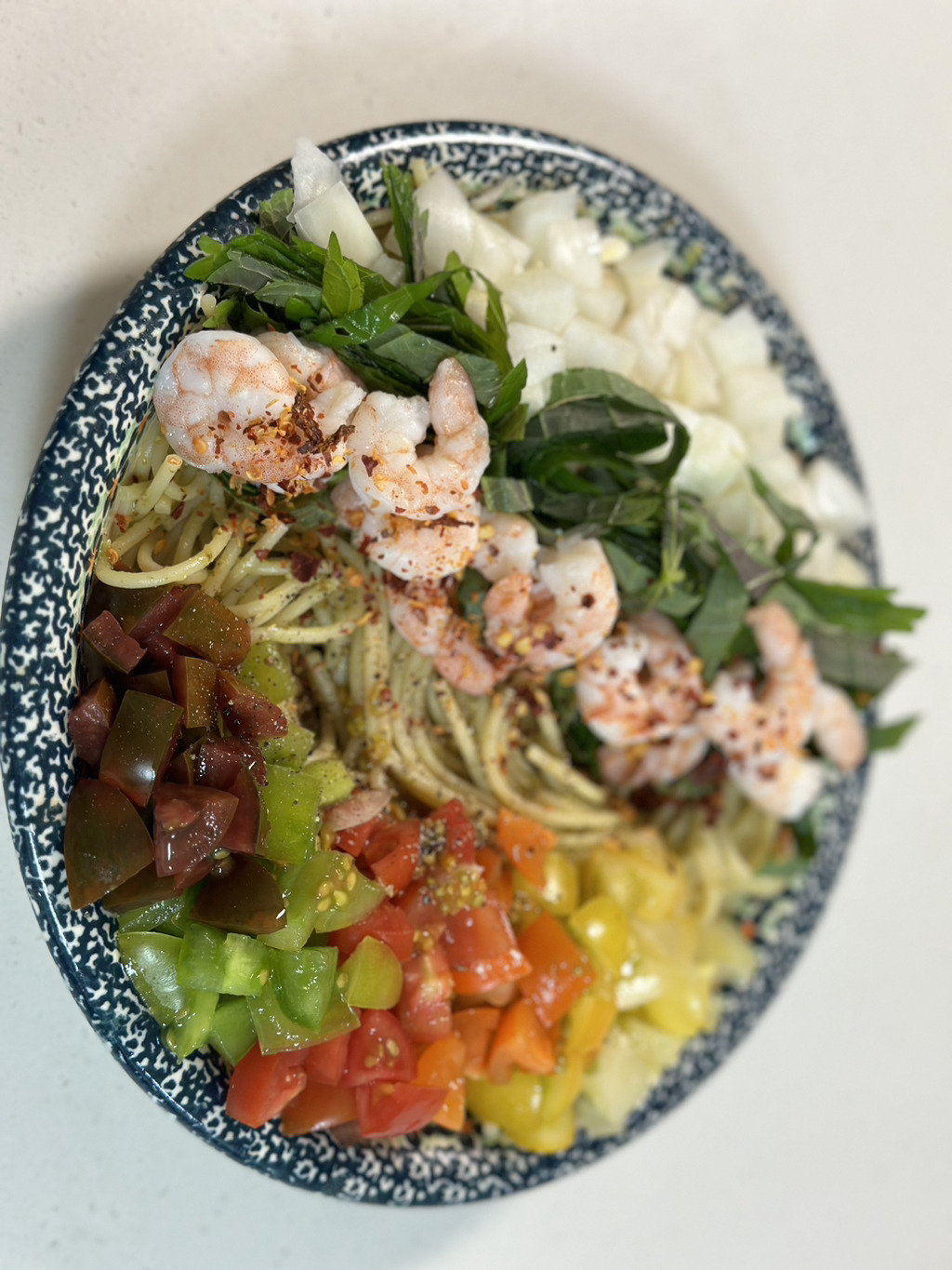 바질페스토 버무린 파스타면에 토마토 양파 깻잎 새우.. ㅈㅁㅌ 입니다