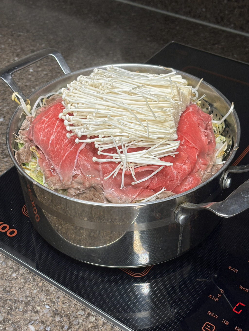 배추깔고 숙주깔고 고기 채반에 받쳐 찌기