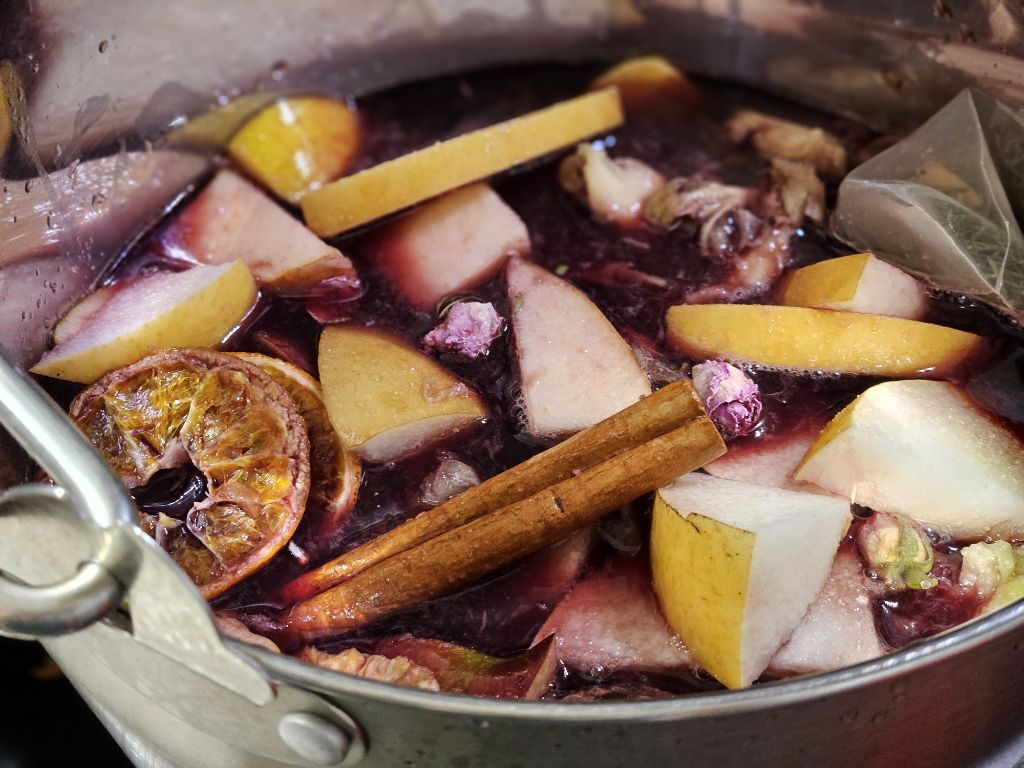 뱅쇼입니당! 로즈+로즈마리 뱅쇼키트에 배, 사과, 청귤, 청레몬, 키위 넣었어요! 장미향이 덜 나서 아쉬워요ㅜ