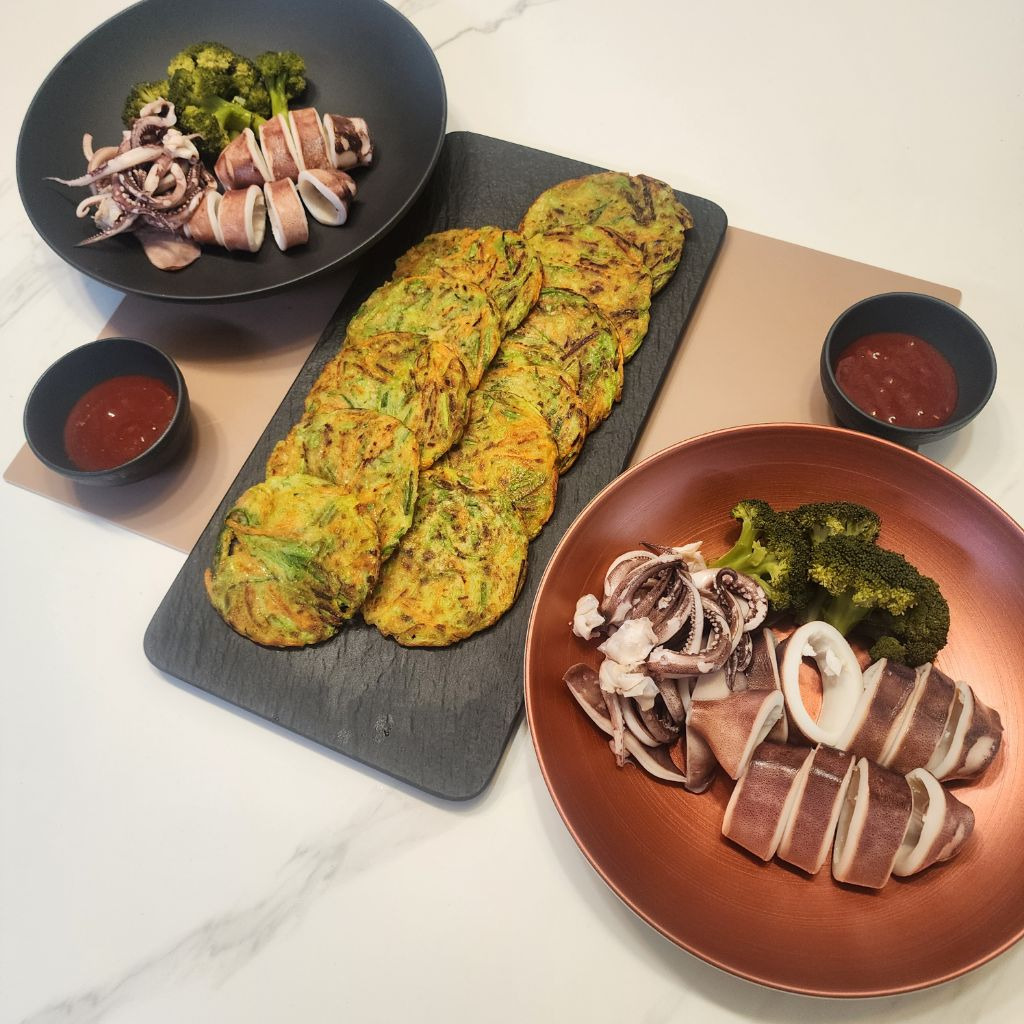 오늘 점심이유 친구가 바닷가에서 오징어를 보냈시유. 볶아먹는건 예의가 아니라 숙회로~호박이랑 당근으로 부침개해서 대충먹었슈