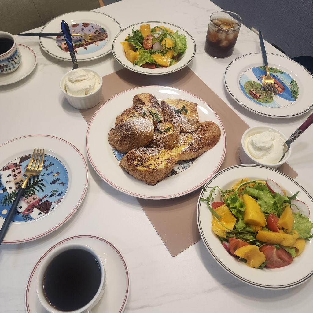 어제아침 느즈막히 빵과 샐러드로 때웠슈.바게트로 프렌치토스트처럼 해먹으면 맛나유.