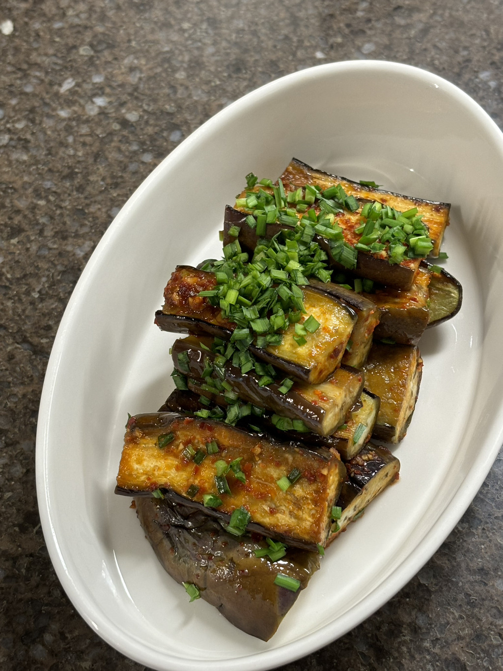 1. 가지를 버터에 굽는다(가지3개에 버터 10g)2. 간장2 미림1 설탕 0.5 물2 고추가루 0.5 참기름 약간다진마늘1 섞어서 붓고 졸임(두부조림 양념과 같음)3. 쪽파 또는 부추로 데코