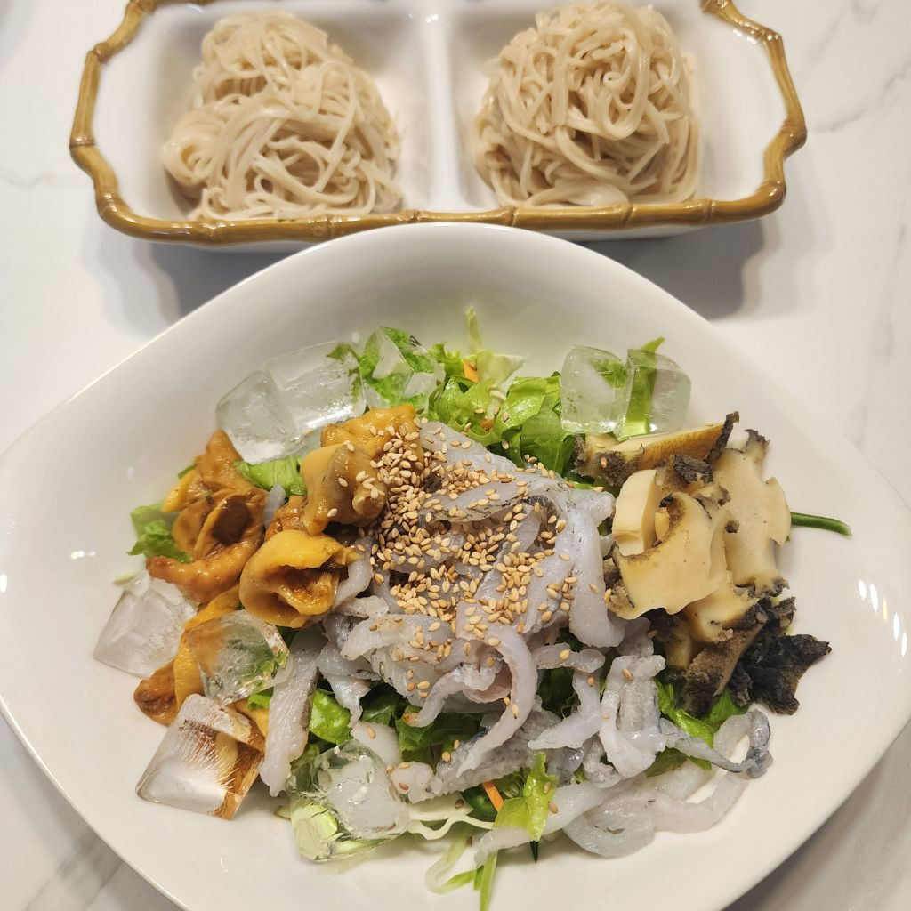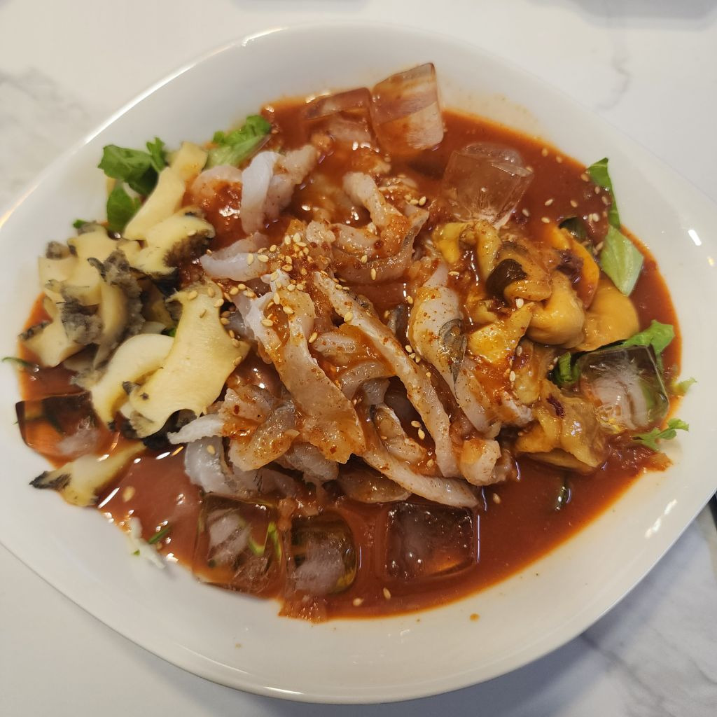오늘 날씨가 후텁지근하고 덥네요.시원하게 한끼 먹고싶어 물회준비해봤슈.세꼬시와 신선한 멍게 준비하고 냉장고에 소중하게 킵해둔 전복도 잘라요.텃밭에서 수확한 오이고추와 상추도 자르고냉장고에 있는 채소들 탈탈털어봐요.현미국수삶아두고 양념육수 만들어서 부어 맛있게 먹어유~~