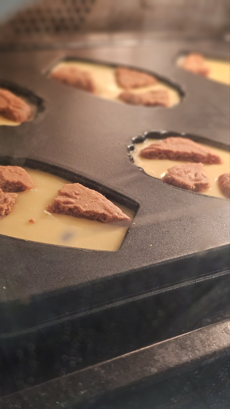 8) 휴지 후 틀에 반죽 80% 채워주고, 로투스 뿌져서 올려주기