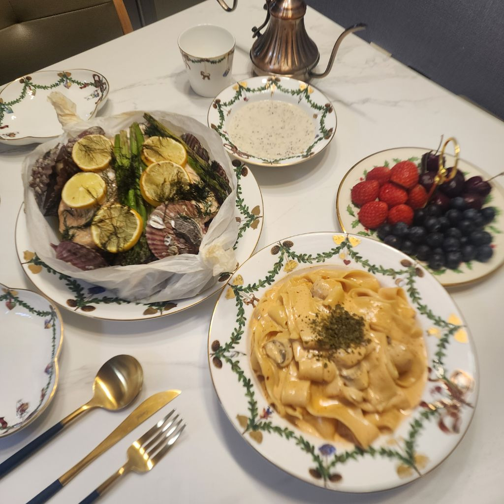 크리스마스근처였나 연어와 해산물 잔뜩넣어 파피요트랑 파스타했습니다.
